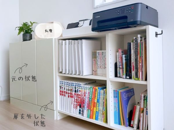 下の子が大きくなるにつれ、触れて危ないモノが減ってきたことから、扉を外し手に取ってもらいたいモノを中心の収納に変更。
