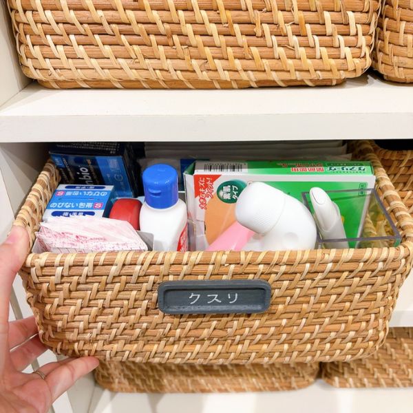 収納するモノは家族がよく使うモノに限定し、その中でも特に使うモノをケースの手前に収納することで、ケースを全部取り出さなくてもサッと出し入れできるようにしました。