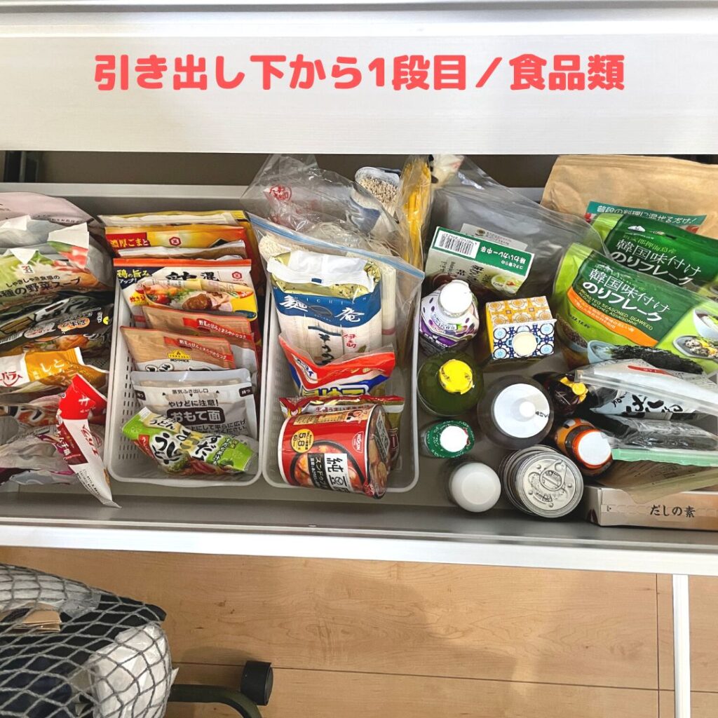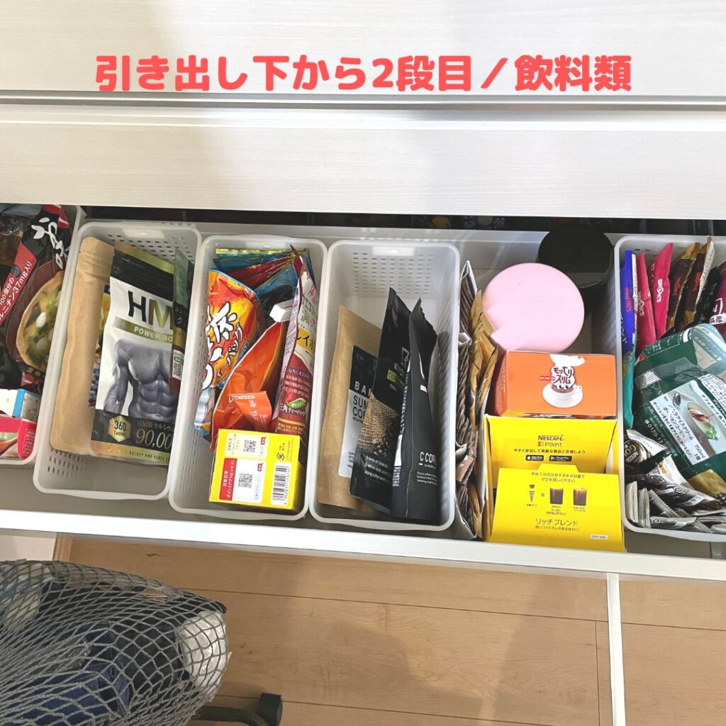 引き出しには2軍の食器(使用頻度中くらい)と、元々は食器棚の半分くらいを占めていた飲料や食品類を2つの引き出しに収めました。